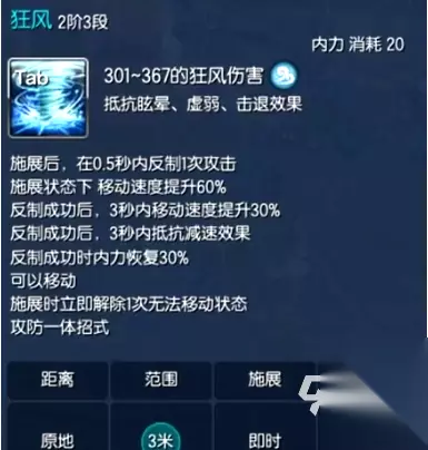 ”狂风”这个招式被大家戏称”大陀螺”,是一个攻防一体的招式,也要20%的体力释放,能造成可观伤害,并且可提升移速,这个招式在野外打群架的时候就非常合适,配合上本身的高防御效果。