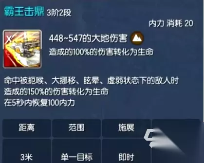 ”霸王击鼎”的招式,在他还没有秒人技能时,能有250%伤害转化的回复,还带来一个5秒的持续回内的效果。”毁灭”很推荐加点,几乎没有前后摇的一个技能,使用时需要消耗20%的内力,伤害能达到3倍。