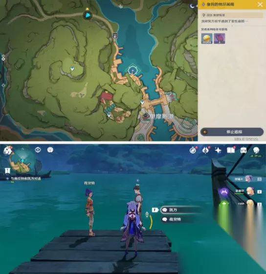 1.去到任务地点与两位NPC对话,得知荷贝特在请求凯万帮忙钓古董。两人一番争执,最后让大冤种去帮忙找“薄荷”。