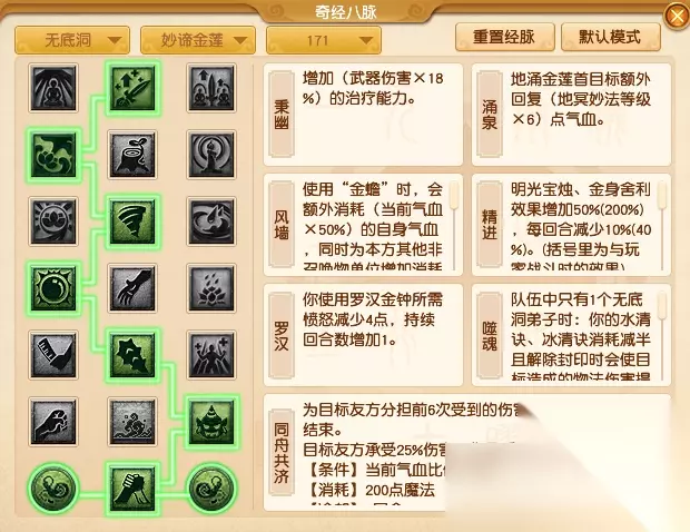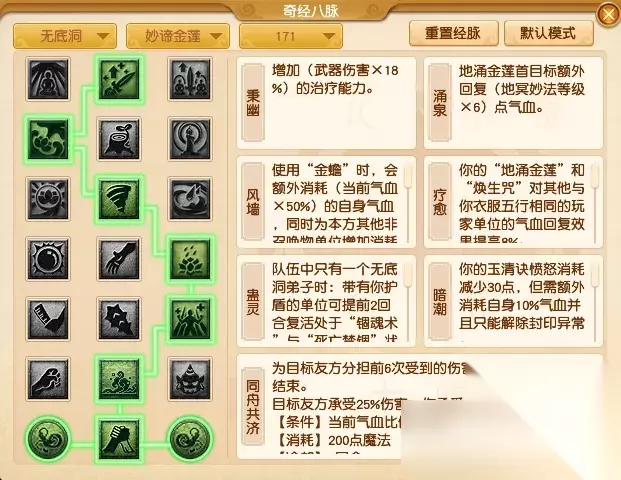 【妙谛金莲】作为无底洞奶脉流派,日常个人依旧推荐经脉点法2121232。 第一排【秉幽】主要是增加无底洞的基础治疗效果。当然有的小伙伴这里喜欢点【灵照】,如果状态加得多当然也不失为一个好选择。 第二排选择面就比较广了,个人比较推荐【涌泉】,以此弥补治疗效果上的损失。 第三排可以选【风墙】来给队伍提供护盾增益,这也是无底洞奶脉的一个特色玩法。 第四排可以选【精进】来给队伍提供法术伤害结果减免、物理伤害结果减免等增益。 第五排推荐选【罗汉】提高罗汉金钟持续回合数的同时降低所需愤怒。如果是配合点杀就可以选【持戒】来提升惊魂掌的效果。 第六排喵推荐【噬魂】,个人感觉水清的使用率在日常任务中更加的频繁,而且还可以给输出门派增加输出。 第七排大招【同舟共济】。