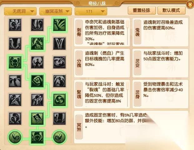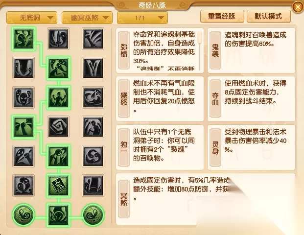 【幽冥巫煞】作为无底洞秒脉流派在与玩家对战时,个人推荐经脉点法3212322。 第一排推荐【刺骨】,经脉起始就是为了在玩家对战时提高固定伤害。 第二排【鬼袭】提高的伤害可以对召唤兽进行补刀。 第三排其实【分魄】和【盛怒】都可以。 第四排上排选了【分魄】可以在此排选【灵变】,上排如果选了【盛怒】就可以选【深刻】来配合鬼袭。 第五排选【聚魂】同样是为了提高造成的固定伤害。 第六排可以选【灵身】来增加自身的抗性。 第七排大招【冥煞】亮点就是双倍伤害。 PS:单一的秒无底在玩家对战中其实挺少见的,带来的效果并没有咒普陀那么亮眼。