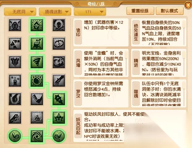 【摄魂迷影】作为无底洞封脉流派本次并没有变化,个人依旧推荐经脉点法2222332。 第一排推荐【诡印】主要是为了增加封印命中等级,可以作为辅封选择。【阴魅】比较适用于单封首发。 第二排推荐【绝处逢生】,抢速度小伙伴的首选,相当于一只小神马。 第三排推荐【风墙】在封印能力不错的情况下也可以给队伍提供护盾增益来提高整个队伍的生存能力。 第四排可以选【精进】来给队伍提供法术伤害结果减免、物理伤害结果减免等增益。当然也可以选【妖法】在特定天气来提升自身速度。 第五排单封以封印为主建议上排选【妖法】这里选【烈煞】提高封印命中,那么下排就选【暗潮】。以半封半辅上排就选【精进】这里选【罗汉】提高罗汉金钟持续回合数的同时降低所需愤怒,那么下排就可以继续选【噬魂】。 第六排主要视第五排的选择。 第七排大招来了【妖风四起】,拥有不错的封印命中率和独特性(四清无法解除妖风四起)。 PS,用这个流派做队长任务的话,因为没有救人也没有推3,还请注意携带九转等救人药品。 幽冥巫煞流派经脉推荐