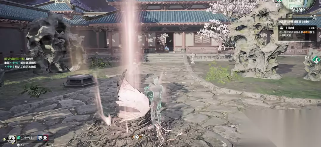 除了等待队友,你也可以选择主动自我复活。在变为魂冢后,你可以长按E键主动舍弃身躯,进入灵魂状态。你的灵魂可以在地图上自由移动,前往任何一座发着冲天红光的返魂坛。与返魂坛互动后即可完成复活,重新投入战斗。通常情况下,每局游戏在第一次暗域(毒圈)收缩结束前,每位玩家都拥有一次这样的免费复活机会。这次机会会消耗一个名为还魂花的道具,在组排模式中,开局时会自动获得一个。