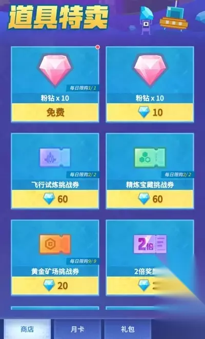 商店每日领取 点击主界面商城按钮,再点击商店,最上方就可以看到可以每日领取的粉钻。虽然只有10粉钻,但正所谓蚊子腿再小也是肉,免费给的果断拿下!