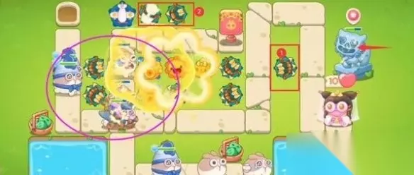 3、打完石狮子后,在这里放置两个多重箭,为了更好地清除右边的障碍物,为后期做准备,放置完多重箭后,需要注意后面的兔子会增多,可以在兔子洞这里放置一个飞机,有效补充伤害。