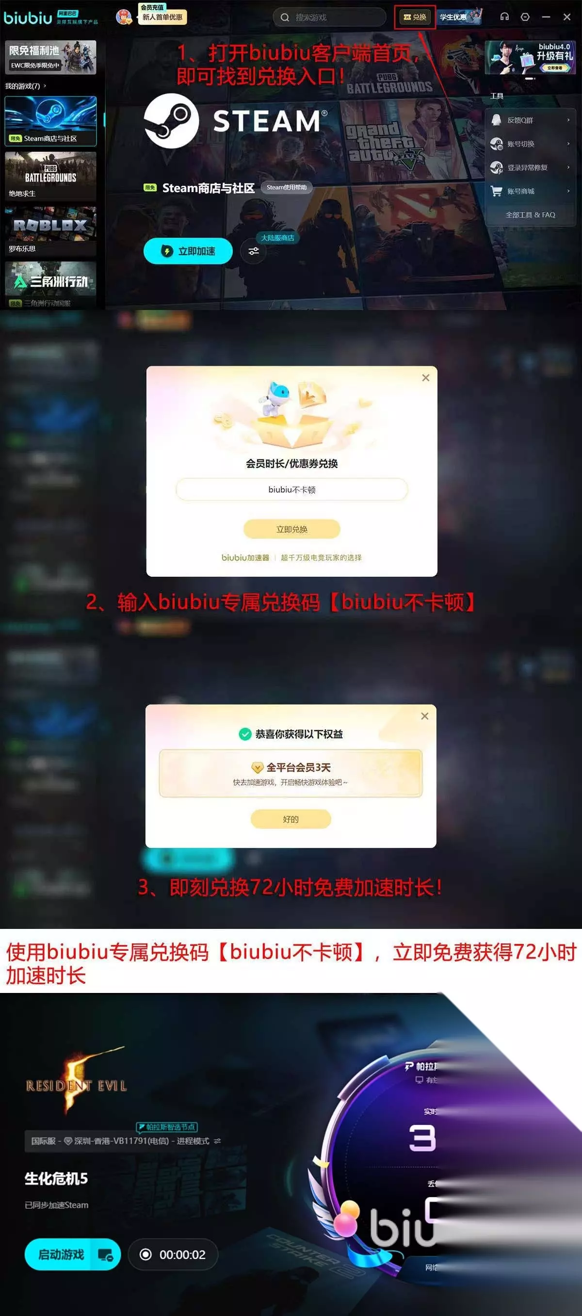 就生化危机5来说,所需的就是画面不掉帧,战斗不卡壳,玩起来顺手就让很多玩家满意了,这在biubiu这里可轻松获得,而且还能有免费时间使用,领取也很简单,注册成功能拿到系统送的24小时,登录后打开首页“兑换”,粘贴或填写口令【biubiu不卡顿】还能再得到72小时,两者一叠加就有96小时。