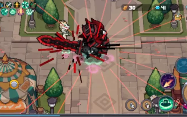 这是手游元气骑士的游戏内容分享,展示了机械姬使用摇摆大激光战斗的实战场景,呈现了酷炫的满屏攻击特效,给玩家带来震撼的视觉战斗体验。
