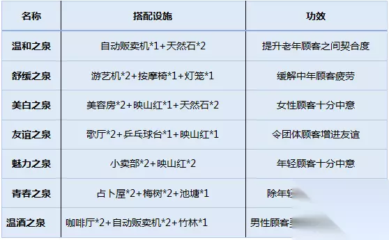 (小温泉布局图) 非常遗憾的是小编并没有配出功效全部聚齐的温泉布局,所以为大家提供的示例图只能达成其中四种功效。 希望各位玩家在阅读本篇攻略的同时也多加思考,请加油规划出比小编更厉害、更合理的温泉布局吧!