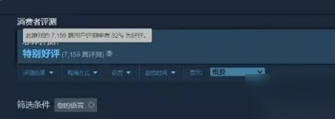 目前游戏在Steam的好评率为92%,共有7159条评价,为特别好评。