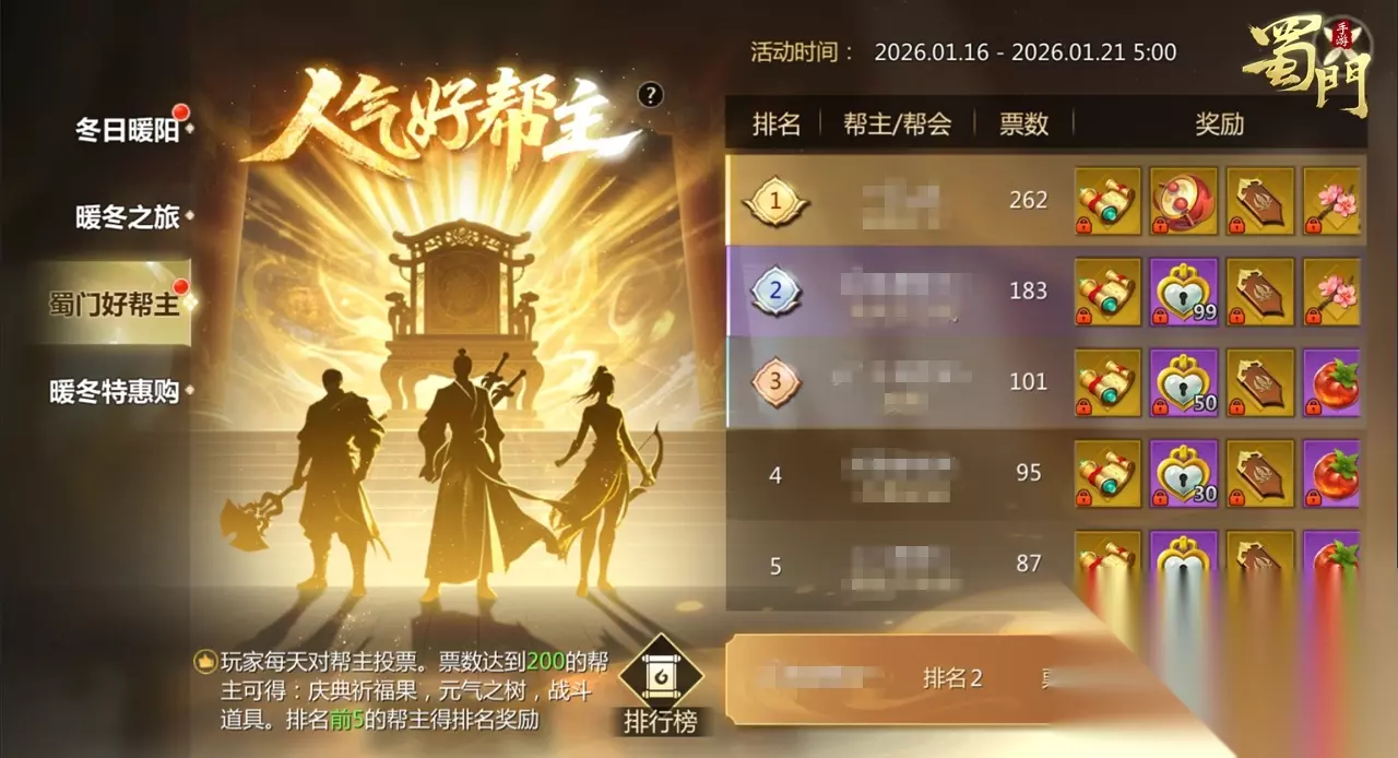 完成每日任务及成就任务即可获得神游币,可在活动商店兑换超多奖励道具,其中奖励包含仙灵自选包,打开后可以从牛将军、熊少侠仙灵皮肤中任选其一获得。还有动态表情自选、假日礼盒、仙魂等你兑换。 蜀门好帮主 活动时间:2026年1月16日-1月21日 5:00 活动内容:各位达到50级以上的帮会成员可为心仪的帮主投上宝贵的一票,每天免费投票2次,花费钻石可额外获得投票机会,每次投票均可获得仙灵领悟丹、纯洁仙灵草、紫玄果及大量经验灵力。 活动期间,票数达到200票的帮主可获得元气之树、战斗道具自选包和祈福果实;而最后也将根据投票排行榜为前5名的帮主发放包括限时称号、帮会天诛令、元气之树在内的奖励!