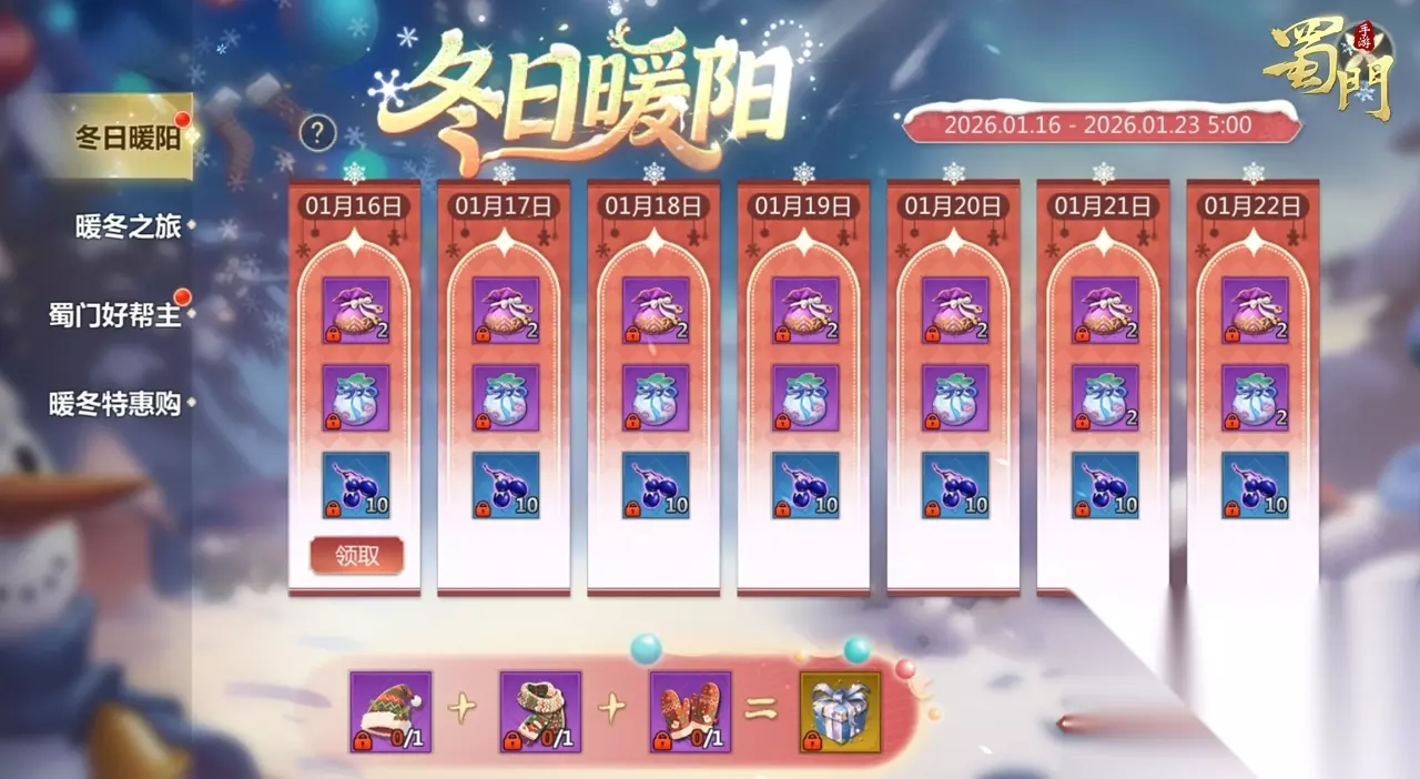 蜀门们早上中午晚上好! 最近是不是感觉蜀仙盟的寒风都带着一丝福利的甜味了? 没错,咱们冬日专属的“真香”福利活动,它!又!来!了! 话不多说,快来一起看看都有哪些“又暖又香”的活动吧! 冬日暖阳 活动时间:2026年1月16日-1月23日 5:00 活动内容:每日登录游戏即可免费领取日常资源自选包、暖冬锦囊、紫玄果;打开暖冬锦囊可以自选获得暖冬绒帽、暖冬围巾、暖冬手套。集齐这三件暖冬套装可以合成【暖冬礼盒】;打开暖冬礼盒就有机会获得天佑宝石、玄云幻诀和完整光芒石等超值奖励。