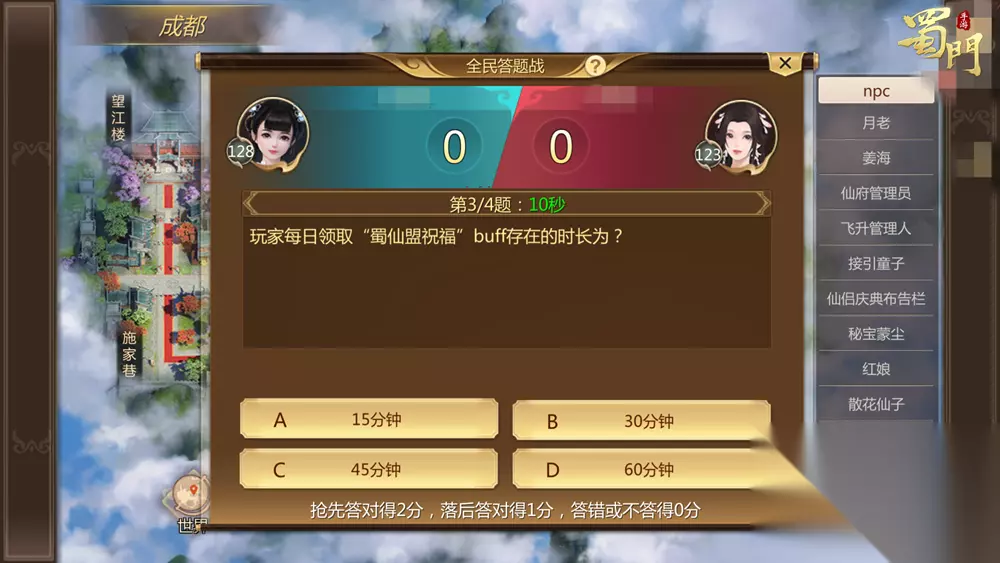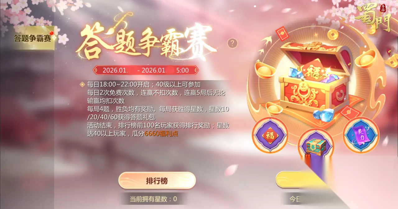 答题争霸赛 活动时间:2026年1月19日-1月23日 5:00 活动内容:活动期间,每日18:00-22:00可以有2次免费参与答题PK的机会,与匹配的对手一较高下!相较于题目的难易程度,手速更是关键,不管胜利与否都可获得灵力、仙魂奖励。