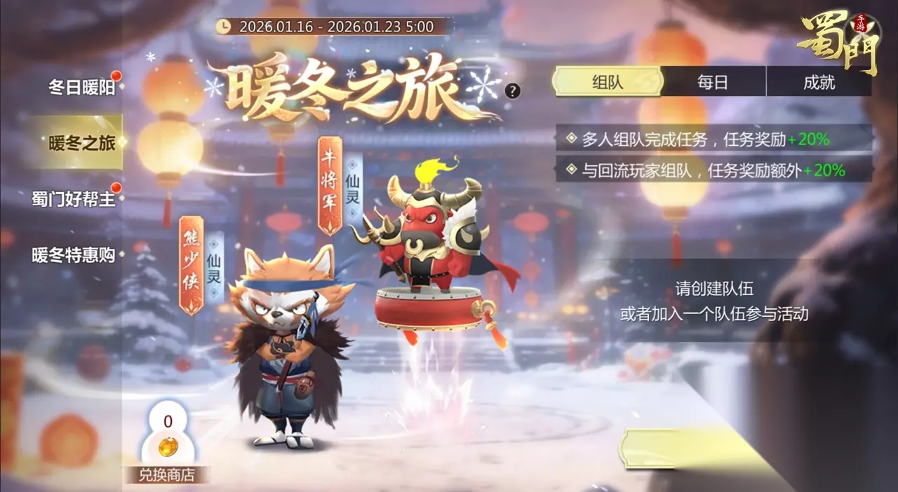 暖冬之旅 活动时间:2026年1月16日-1月23日 5:00 活动内容:玩家需要创建队伍或者参加他人队伍一起完成每日任务和成就。队伍人数最少为1人,最多为2人。单人组队无额外奖励,多人组队时完成任务有额外奖励。如果是与回流玩家组队,完成任务会获得更多的额外奖励哦!