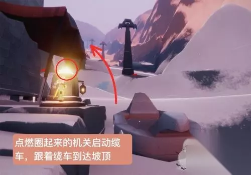 3、我们点燃缆车机关,到达山坡的顶部;