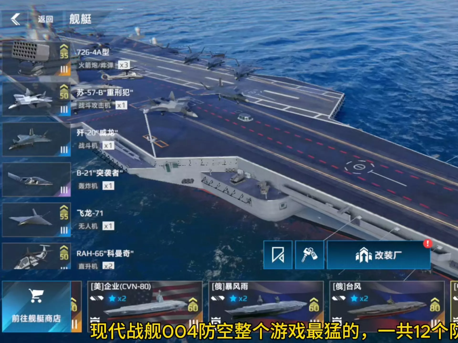 这是《现代战舰》的游戏内容展示,呈现了玩家驾驶战机在匹配模式中对战的过程,吐槽敌方强力防空,还展示了004型航母、F-19地狱猫战机等装备的作战表现。