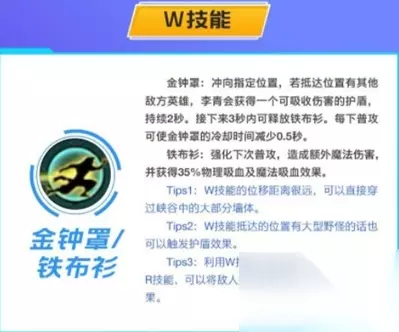 三、小提示 Tips1:W技能的位移距离很远,可以直接穿过峡谷中的大部分墙体。 Tips2:W技能抵达的位置有大型野怪的话也可以触发护盾效果。 Tips3:利用W技能位移至敌方身后,再使用R技能,可以将敌人踢回友军方向,打出回旋踢效果。