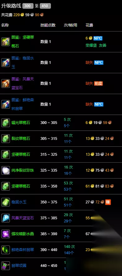 珠宝300-450最省材料升级路线: