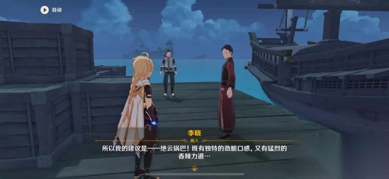 来到离岛,跟李晓对话,得知他推荐的菜是:绝云锅巴
