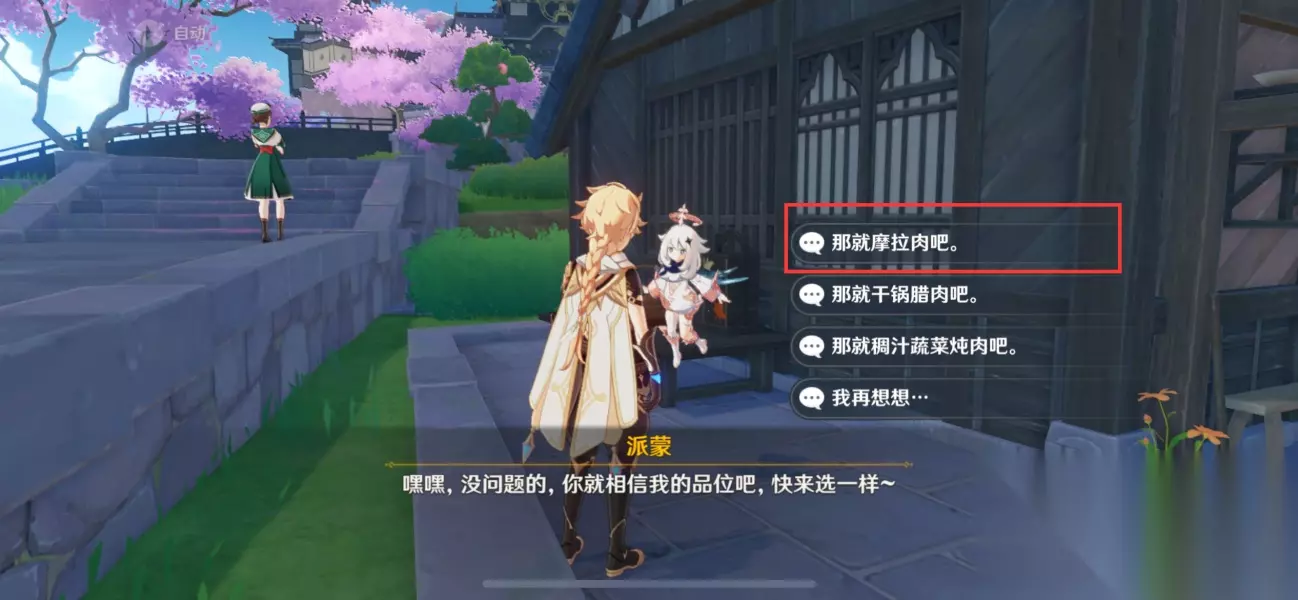 对话得知,她想吃璃月带肉的菜,有三道菜可选(出现菜肴不同,无影响,按需选择) 我选摩拉肉,后续给汤雯提供的也是该道菜,不然不会触发后续任务