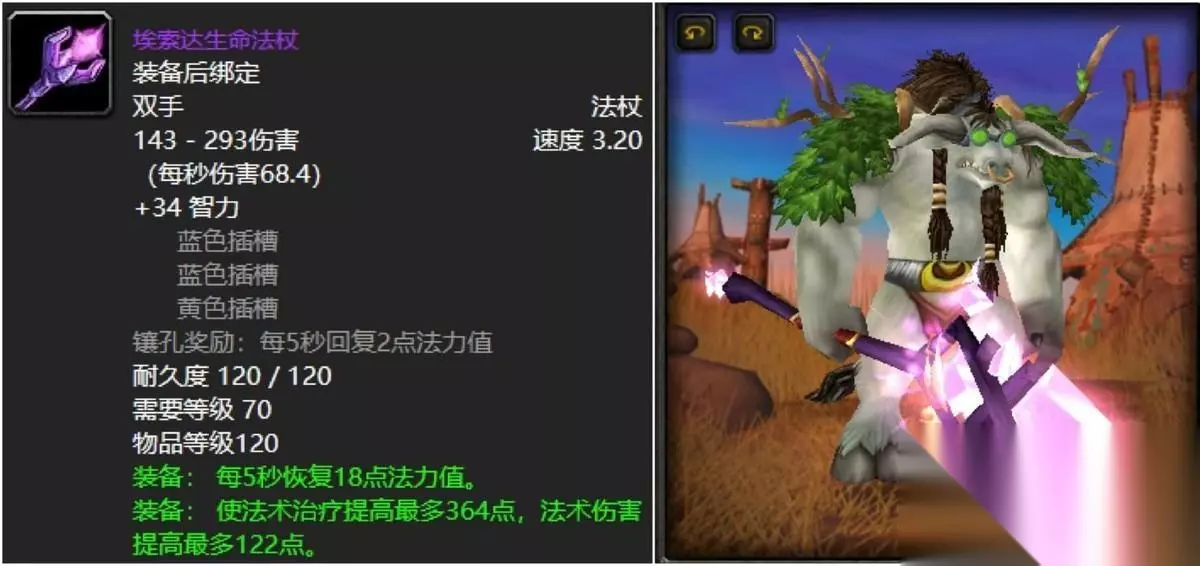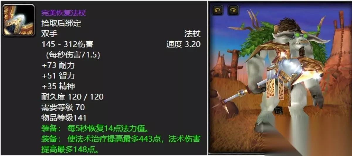 狗杖这东西真的是术士更爱,搭配T6套装翅膀特效俨然一副高姿态。实力方面的话也是高急速搭配爆击着实不错,后期不够用的唯一问题也就是法伤欠缺了点,还有就是没有给安排上几个可人的插槽,不然就这东西指不定都能给你带到80级。 四:完美恢复法杖