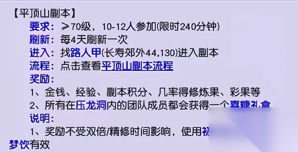 1、平顶山是一个比较大型的副本,需要10-12人才可以开启。 2、因为1个队伍最多只能5个人,所以至少需要2个队伍才能进入平顶山副本。 3、这个副本难度是比较低的,因此个人感觉这个人数要求是太多了,没有必要这么多人,但设定如此也没有办法。