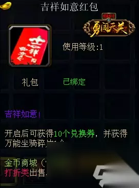 【万能坐骑兑换券震撼登场,万兽之王不是梦】 活动简介: 备受期待的万能坐骑兑换券终于与大家见面啦,各种坐骑随心换,群兽臣服你脚下!万兽之王不是梦! 活动内容: 1、活动期间,前往金币商城购买任意一档红包开启,即可获得万能坐骑兑换券; 吉祥如意红包 售价:10两现金; 福如东海红包 售价:50两现金; 万事如意红包 售价:100两现金; 春风得意红包 售价:500两现金;