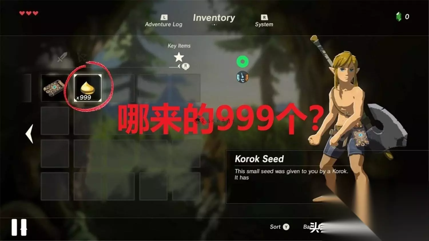 这显然是就是《塞尔达传说:荒野之息》中的大BUG,玩家无须四处移动一个个的去寻找,也无须针对某个克洛格种子、卡bug去刷,而是触发某个漏洞之后,让背包中的克洛格种子数量瞬间来到999,非常效率!值得一提的是:这个bug只能在新存档中使用。