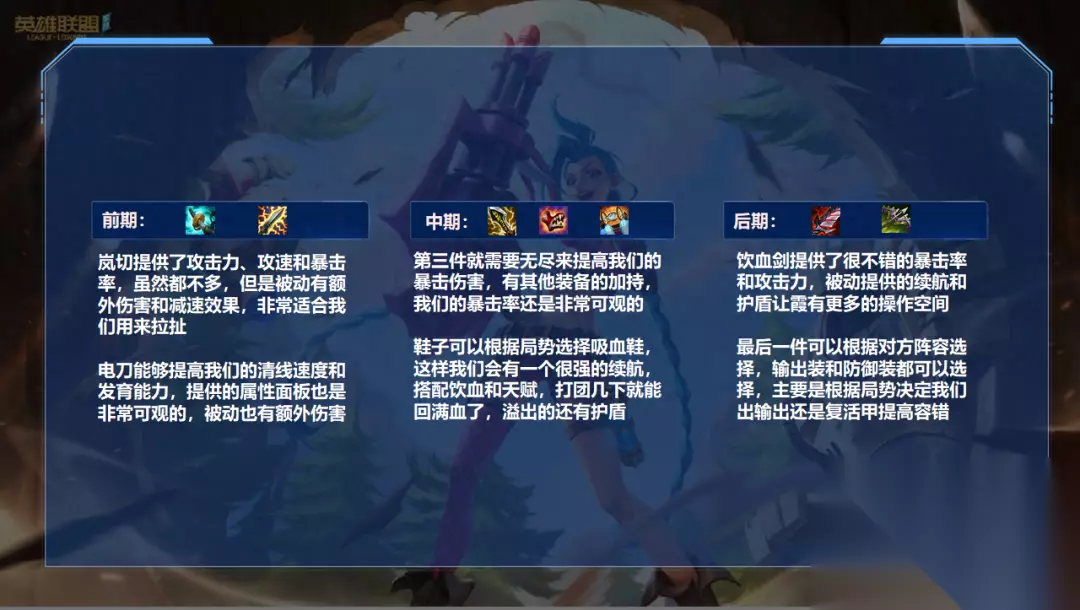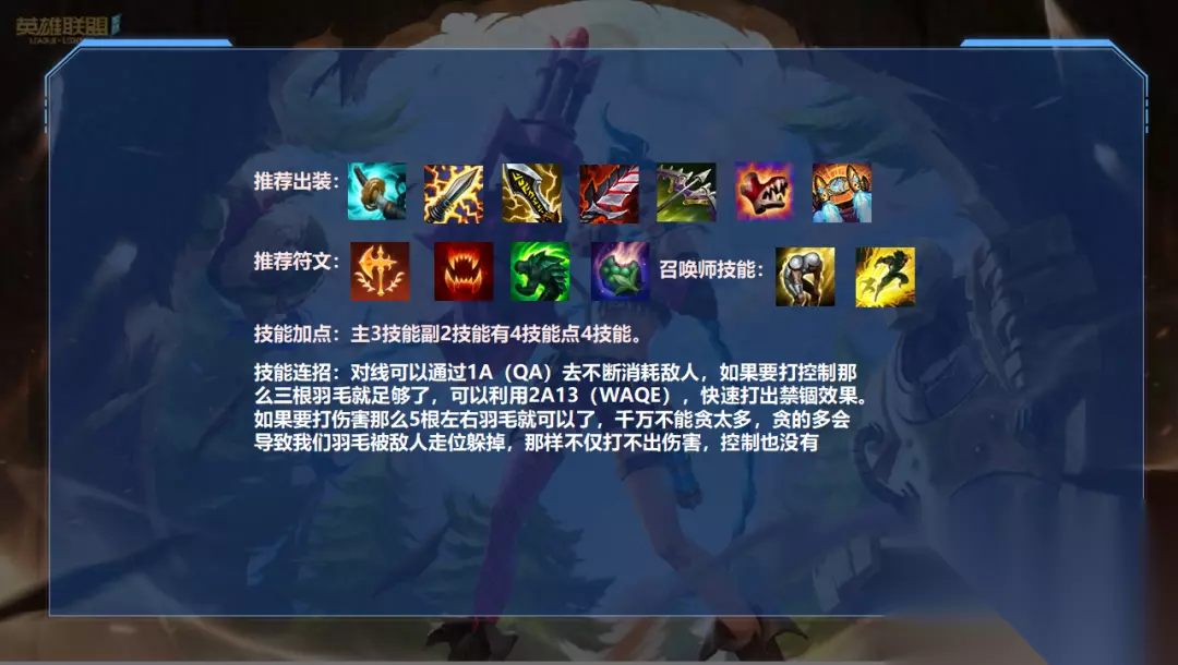 出装方面: 霞的出装是非常多样化的,但如何做出选择,我们首先要看一下当前版本有没有比较强势的装备,如果有,优先考虑版本强势的装备,跟着版本走,永远不会错的。 岚切+电刀强势的地方在于充能可以打出很高的伤害和减速,并且属性面板也非常适合霞,也可以提高霞的发育速度,之后再出无尽来提高我们的暴击伤害和暴击率 饮血则是为了一个续航,如果需要攻击距离也可以选择火炮,如果打肉也可以选择破败或者黑切,之后补一个轻语提高百分比穿透就行,如果担心容错率,最后可以出一个复活甲来保命 推荐天赋: 天赋的话首先一直都是征服者,其他并没有合适的天赋 猎人吸血能够提供7%的吸血,搭配吸血鞋有很强的续航能力 适应性外壳能够提供一个很不错的坦度和容错率 果子可以提供一定的续航能力 技能连招: 对线可以通过1A(QA)去不断消耗敌人,如果要打控制那么三根羽毛就足够了,可以利用2A13(WAQE),快速打出禁锢效果。如果要打伤害那么5根左右羽毛就可以了,千万不能贪太多,贪的多会导致我们羽毛被敌人走位躲掉,那样不仅打不出伤害,控制也没有 对局详解