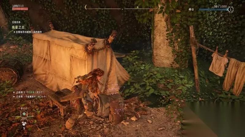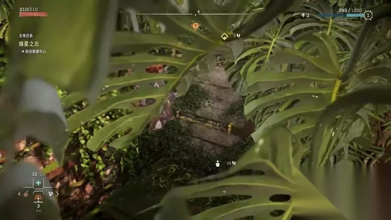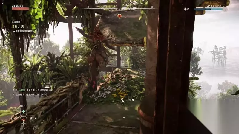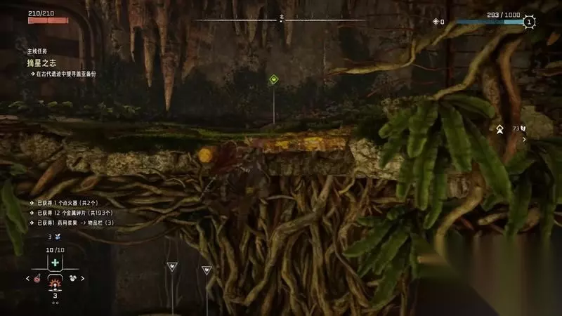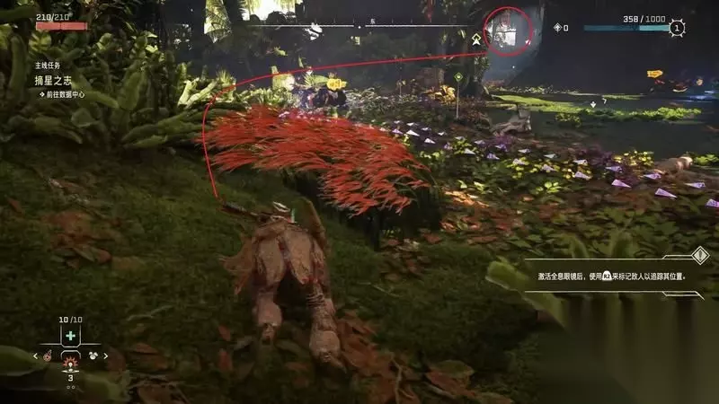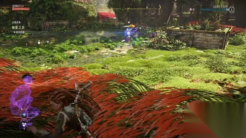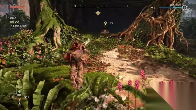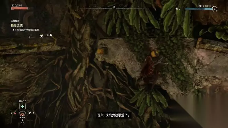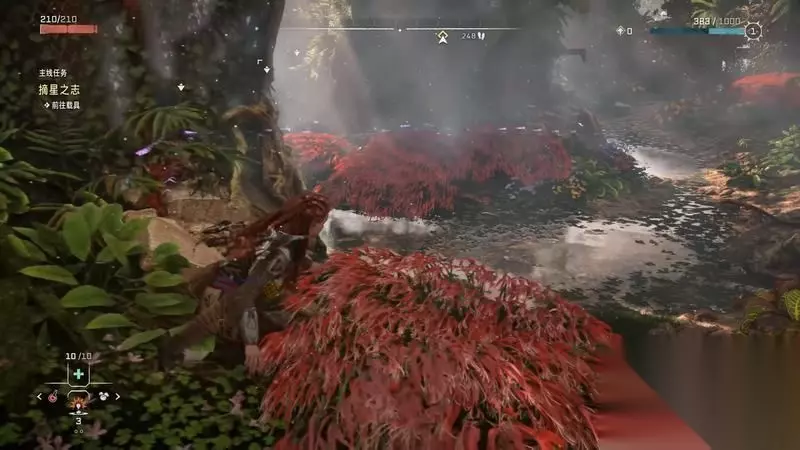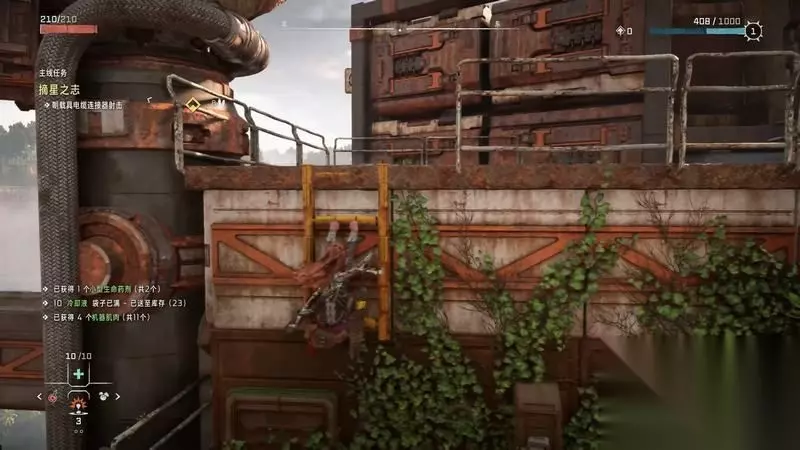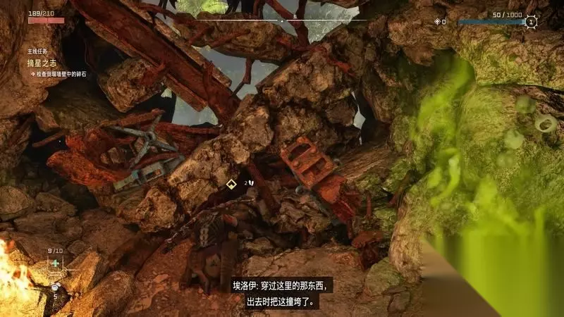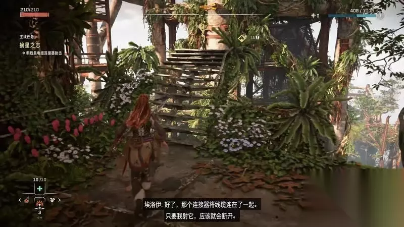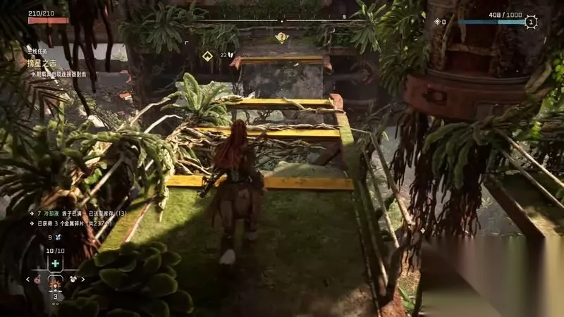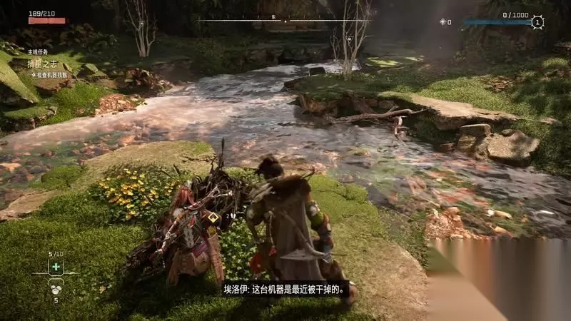 跟着主线的提示框走(脚步数值就是距离预测),下楼梯,来到溪流中,检查被击毁的机器。
