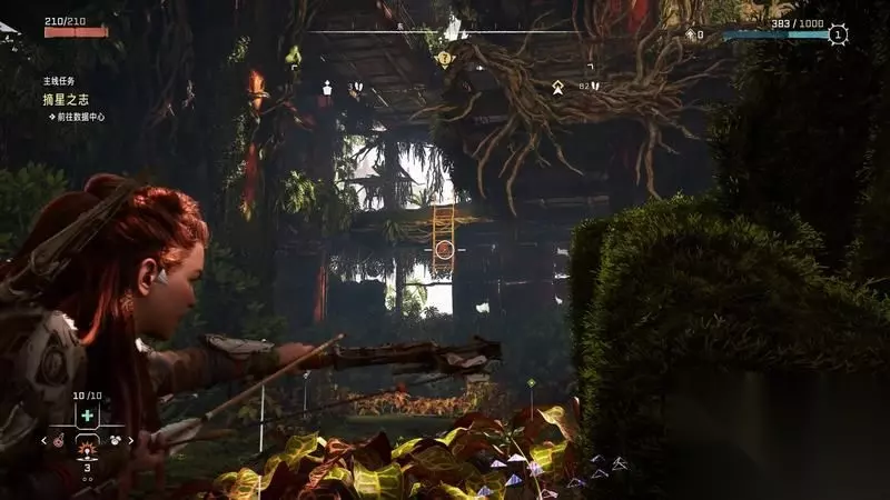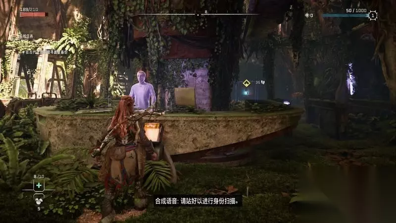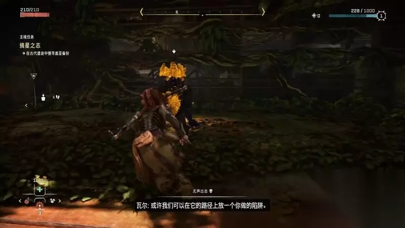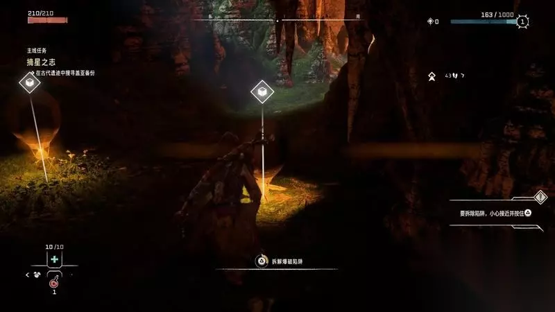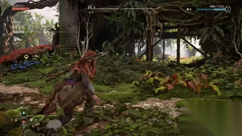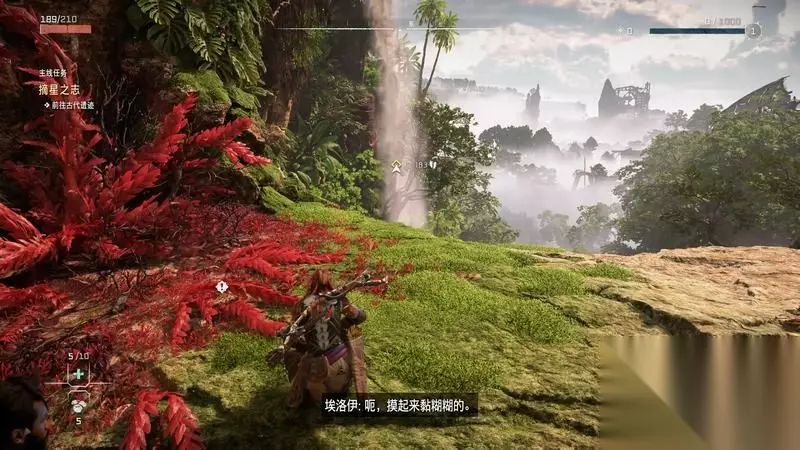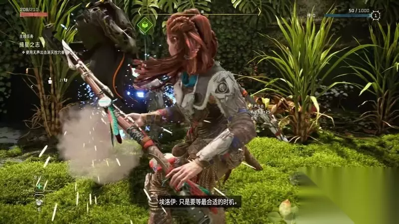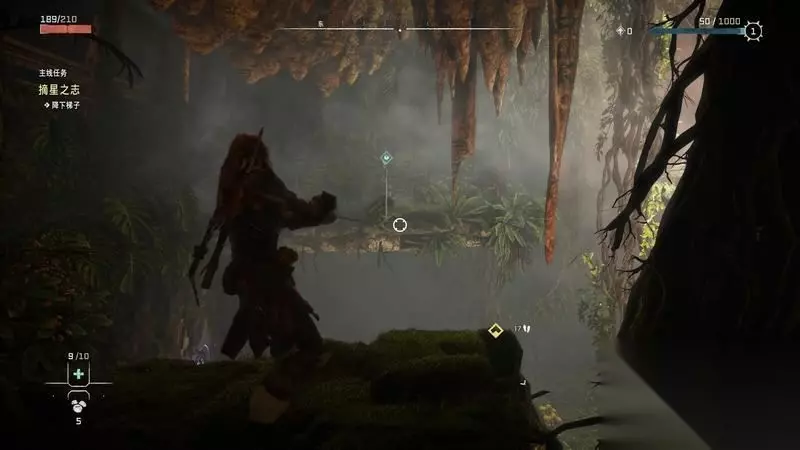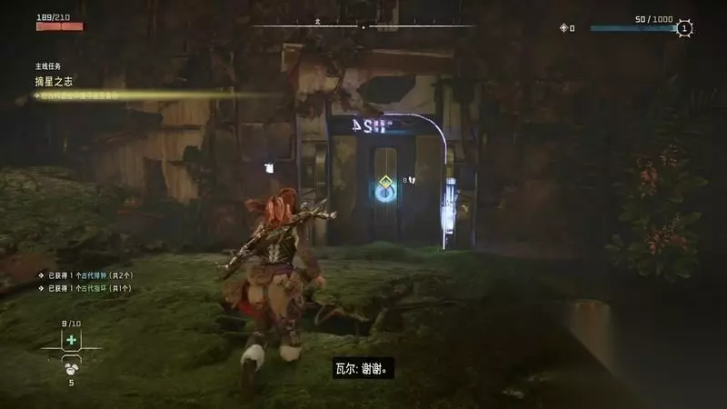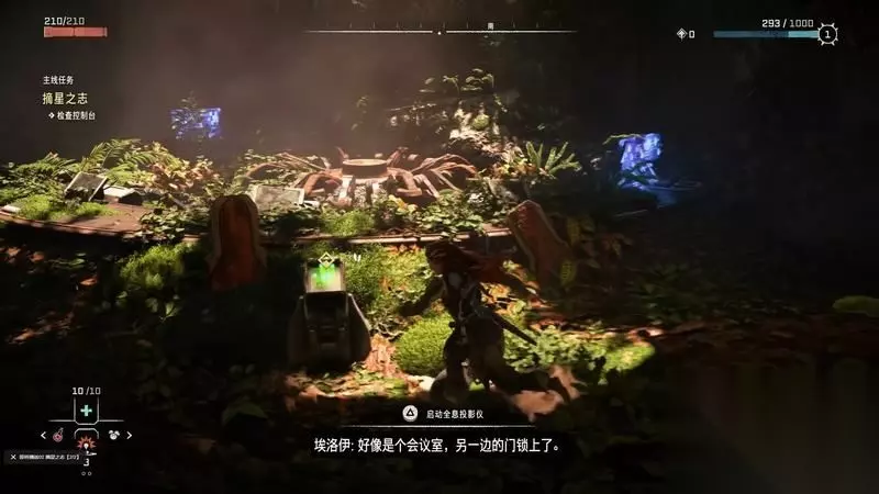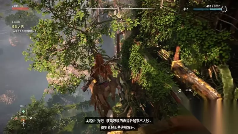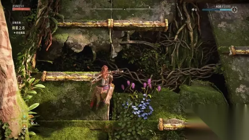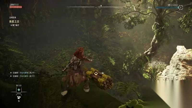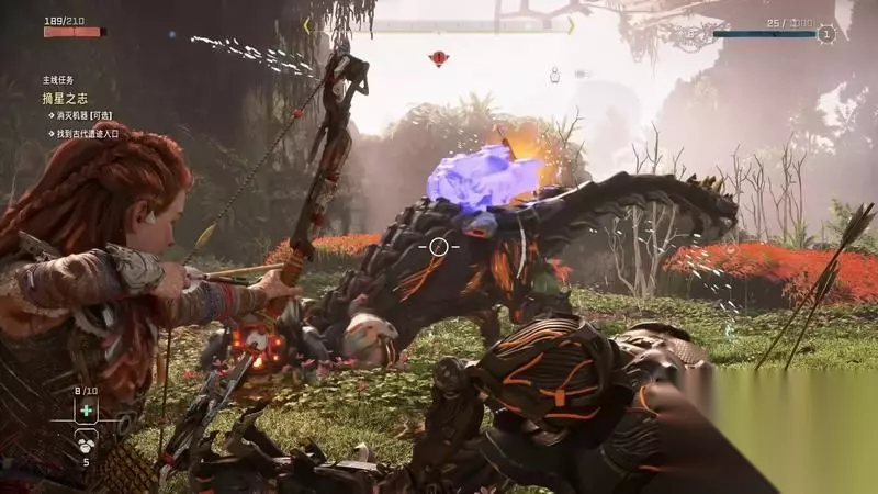 跟着主线的提示框走(脚步数值就是距离预测),下楼梯,来到溪流中,检查被击毁的机器。