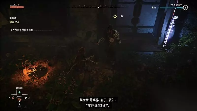 失望的二人只得另寻它法。 离开遗迹的大门前有休息篝火,休息时瓦尔会给予埃洛伊冰冻武器。 后面会有大用场。