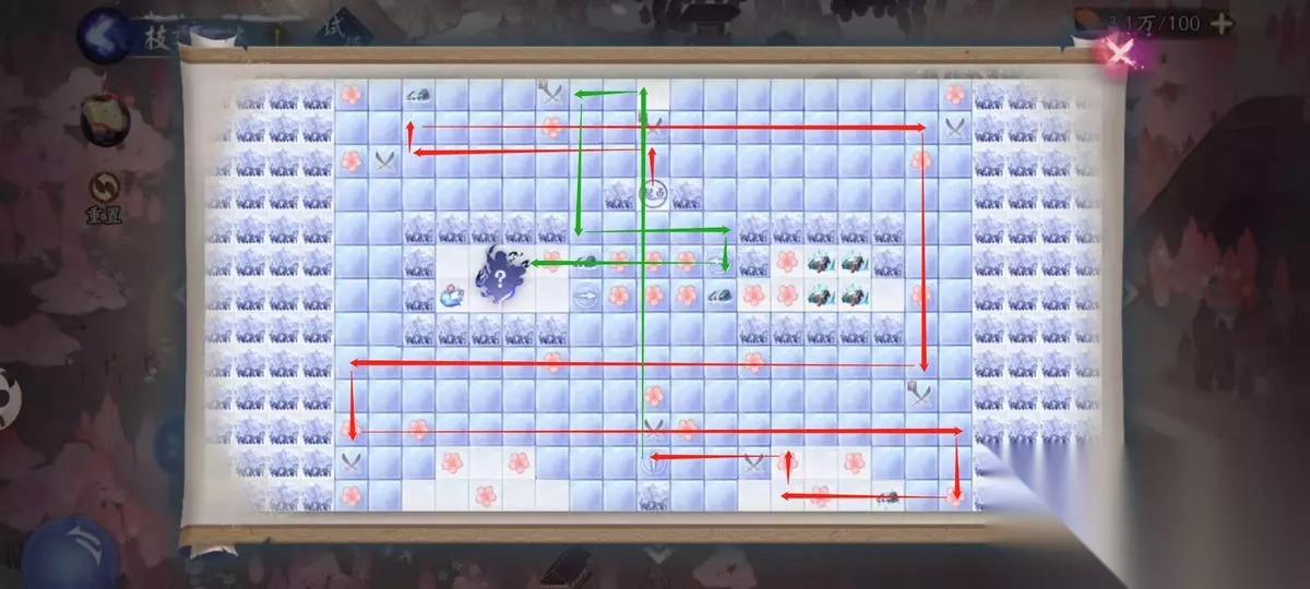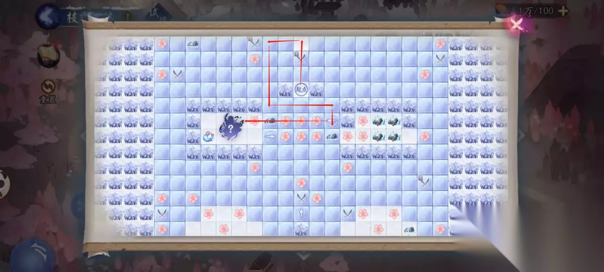 然后还有一个任务是需要玩家在通关中击杀所有的妖灵,这个路线就稍微复杂一点了,我们需要利用妖灵和宝箱的位置来挡住雪女前进的道路,进而规划雪女挑战的路线,妖灵的击杀顺序是非常重要的,如果你提前击杀了不应该击杀的妖灵,就没有办法规划路线了。妖灵挑战完之后,雪女会停留在原本的格子上面,并不会前进一格。