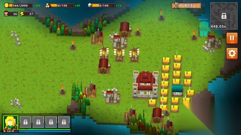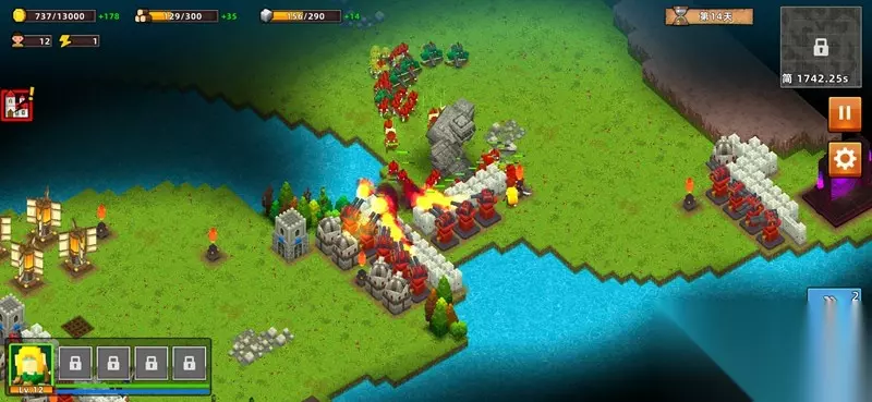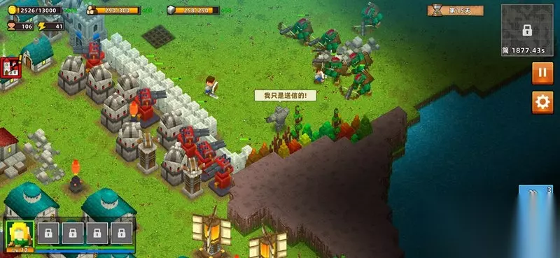 第4、5天主要升级银行、仓库,房屋等,可以多修建一些仓库来增加木材获取数独,多修建银行来增加金币获取速度,同时升级它们来获得更高的效率。PS:前五天不要浪费时间和资源来搭建防御设施,英雄一个人堵在路口就OK了。【五天后】第五天末,在原预想的设防点开始设计防线,修建防御设施。防御措施最前面修建两排砖石城墙,后面放火焰炮,再后面放置大炮,两边可以放置一些弓弩等。记得抽空将火焰炮、大炮进行升级,升级之后攻击伤害简直爆表。