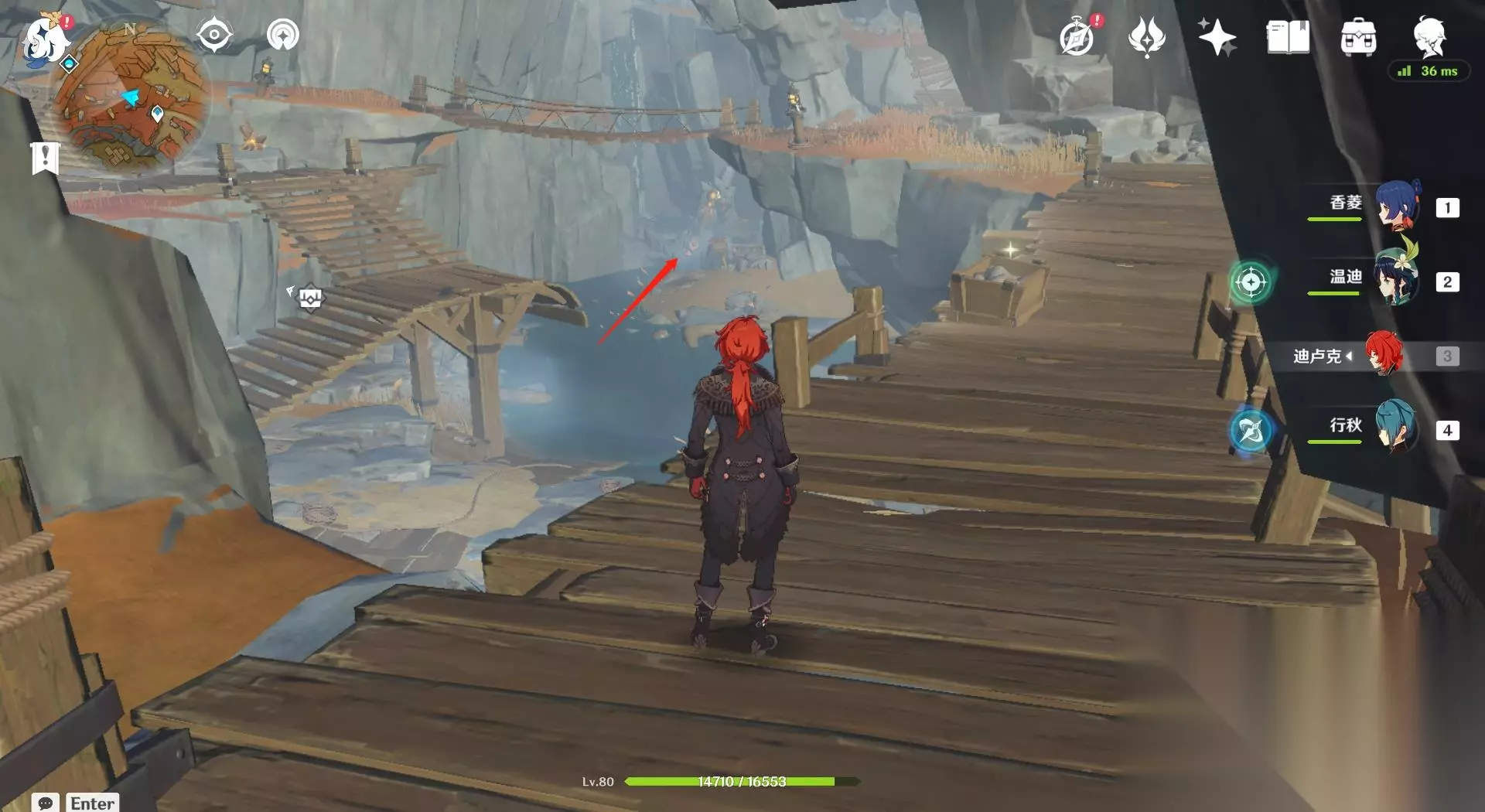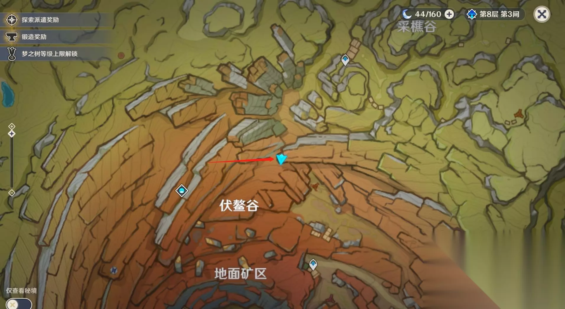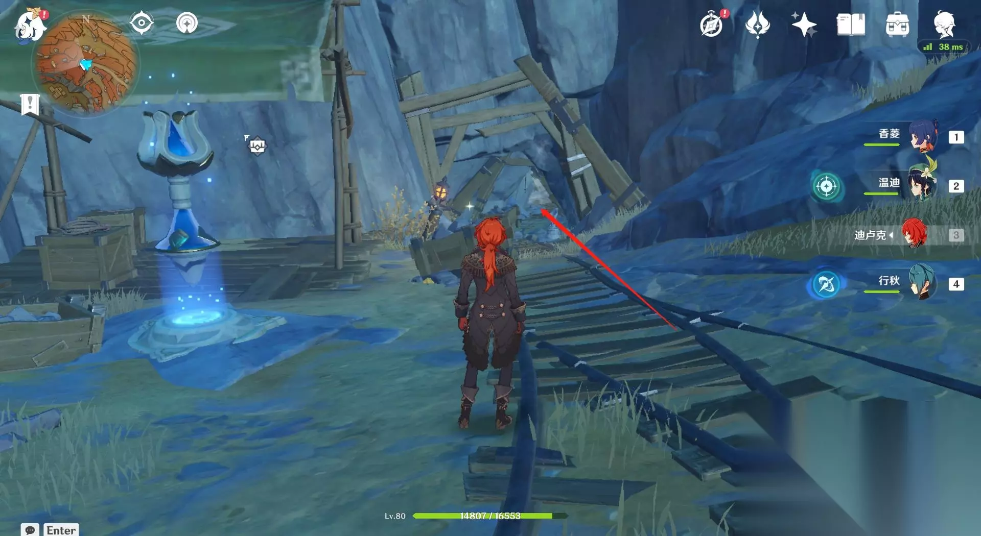 15、在矿洞内一直向着西北方向走会看到一个磐键,去到磐键的位置。