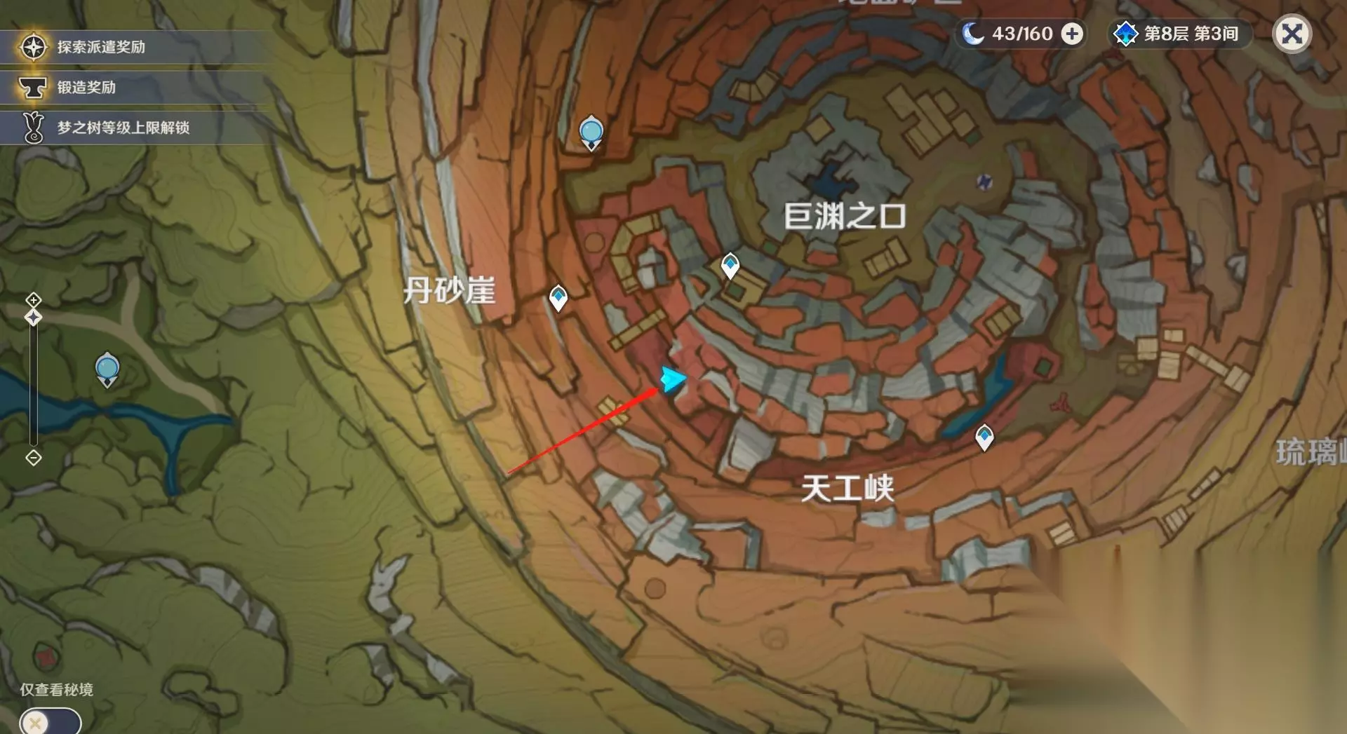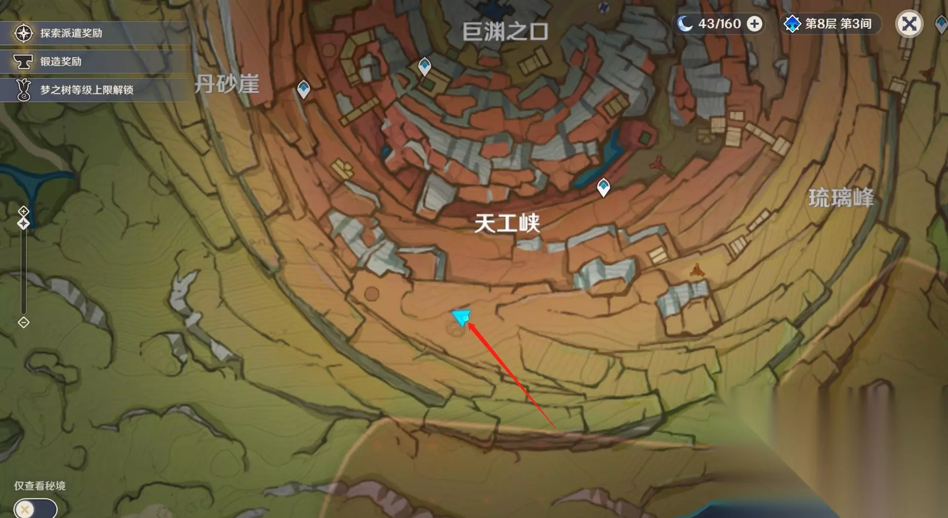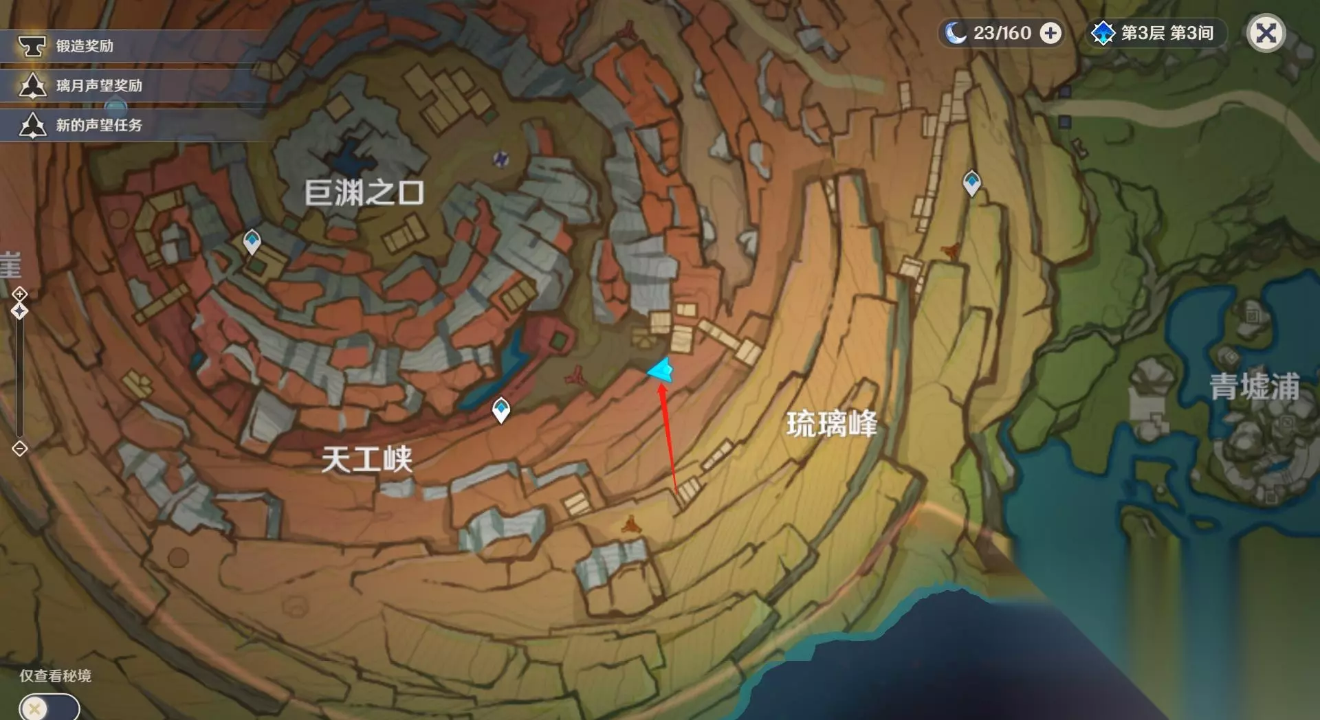 9块老石都分布在层岩巨渊区域内。 1、第一块老石在琉璃峰右上方的山崖上。