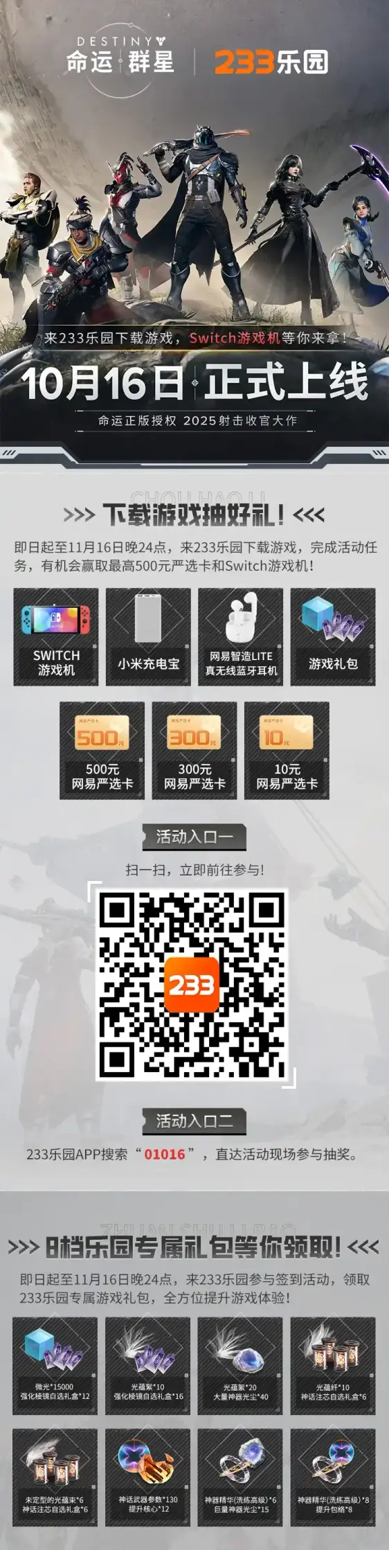 来233乐园下载最新#网易游戏#命运:群星#参与抽奖,有机会赢取Switch游戏机、500元严选卡等好礼!还有签到福利,累签领取海量道具!超多好礼尽在#233乐园#!