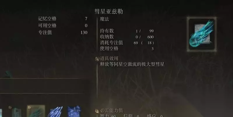 亚兹勒的魔法需要大量的魔力储备和控制力才能释放。玩家在使用亚兹勒之前需要提高自己的魔力储备和控制力,以确保能够顺利施放魔法。 4.熟悉不同的魔法组合技巧 亚兹勒的魔法可以与其他魔法进行组合,产生更强大的效果。玩家需要熟悉不同的魔法组合技巧,以提升亚兹勒的威力和效果。 5.研究环境对魔法的影响 不同的环境对亚兹勒的魔法会有不同的影响。玩家需要研究环境对魔法的影响,并根据具体情况调整自己的魔法使用策略。 6.掌握对抗不同类型敌人的方法 在游戏中,玩家需要面对各种不同类型的敌人。玩家需要掌握对抗不同类型敌人的方法,并选择合适的亚兹勒魔法技能来对付它们。 7.提高反应速度和灵活性 亚兹勒的魔法需要在短时间内做出反应,并且需要具备一定的灵活性。玩家需要提高自己的反应速度和灵活性,以应对各种紧急情况。 8.学会合理运用魔法道具和装备 在游戏中,玩家可以使用各种魔法道具和装备来增强亚兹勒的魔法效果。玩家需要学会合理运用这些道具和装备,以提升自己的魔法实力。 9.深入研究亚兹勒的技能树 亚兹勒的魔法技能树包含了各种不同的技能和特点。玩家需要深入研究亚兹勒的技能树,了解每个技能的特点和使用方法。 10. 11.持续练习和修炼 要成为一名强大的亚兹勒魔法师,持续的练习和修炼是必不可少的。玩家需要不断地练习和修炼,提升自己的亚兹勒魔法技能。 12.制定合理的战斗策略 在游戏中,制定合理的战斗策略是成功使用亚兹勒的关键。玩家需要根据敌人的类型和实力制定出合理的战斗策略,以取得胜利。 13.学会快速调整战术和技能 在战斗中,情况常常会发生变化,玩家需要学会快速调整战术和技能,以适应新的情况和敌人。 14.不断尝试和创新 亚兹勒的魔法是一个充满挑战和创新的领域。玩家需要不断尝试和创新,以发现新的魔法技巧和策略。 15.持之以恒,不断进步 使用亚兹勒魔法是一个需要持之以恒并且不断进步的过程。玩家需要坚持不懈,持之以恒地提高自己的魔法实力,以成为一名真正的亚兹勒魔法大师。 以艾尔登法环彗星魔法亚兹勒作为一种强大的魔法技能,在游戏中使用它需要遵循一些特定的要求和技巧。玩家需要了解亚兹勒的基本属性和作用,学习正确的施放姿势和动作,提高魔力储备和控制力,熟悉不同的魔法组合技巧等。通过不断练习和修炼,玩家可以逐渐掌握亚兹勒的魔法,并在游戏中展现出强大的实力。 探索艾尔登法环彗星魔法亚兹勒的神秘力量 亚兹勒是一种神秘的魔法,源自艾尔登法环彗星。它拥有独特的能力和使用要求,为玩家在游戏中带来全新的体验。本文将深入探索亚兹勒魔法的奥秘,介绍其使用要求以及在游戏中的运用。 1.亚兹勒魔法的背景故事