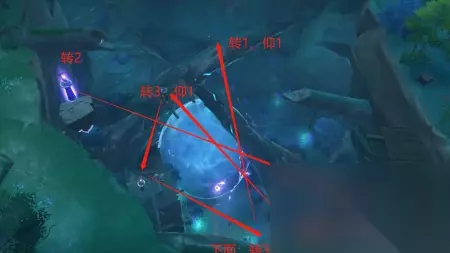个是发射器(光芒最亮的一个) 其一: 地图右边有个紫色的柱子,名为个:调整转向3次(平射,朝向第二个)。地图右上角为第二个:调整转向3次,仰角1次(俯射,朝向第三个)。其他不动。 攻击个,取得镇物(空中一个圆形、地上一个棱形)。 其二: 地图左下角