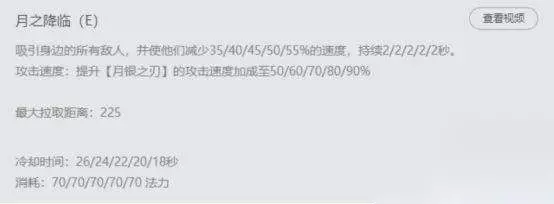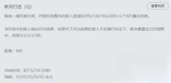 大家可以看到,在R中有月光效果的敌人是,R是没有冷却的。所以六级后的皎月的两段突进,是真的超级可怕的。 技能小技巧:q+r+r这是皎月基本的技能连招,但是千万不要养成QR癌。Q的弹道距离是800并且有弹道飞行时间,R的弹道距离是825,并且是指定目标的。所以当敌人在斩杀线时,不用非要QRR,直接R上去Q就OK了。 英雄打法分析