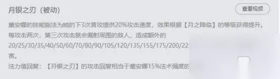 皎月的被动技能,在近几个版本也是有所改动的。增加了伤害,与回复法力值,但是只有第三次攻击才增加攻击速度,与以往的直接赋予20%不同,看起来是个削弱,其实不然。皎月虽然需要攻速,但是前期在线上时,并不是太依赖攻速,反而是回蓝和伤害才是关键。这反而是一个加强。 技能小技巧:在五级之前,要是你能攻击到对方。A两下小兵后,Q+W+A爆发也是超级高的存在。但是皎月6级之前基本上,人家不傻你是很难摸到的。六级也是同理,A两下小兵叠加被动。Q+R+W+E+A+R+a基本上90%的中单会被秒杀。