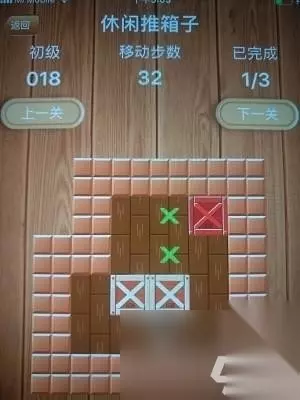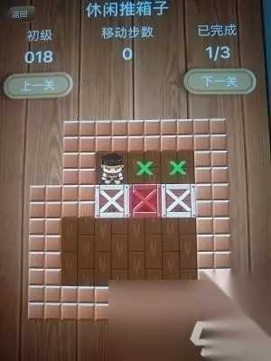 休闲推箱子"/ 休闲推箱子初级第18关通关方法技巧 跟16关的方法一样,把两边的箱子往下推一格,在把中间的箱子往左边推。如下图: