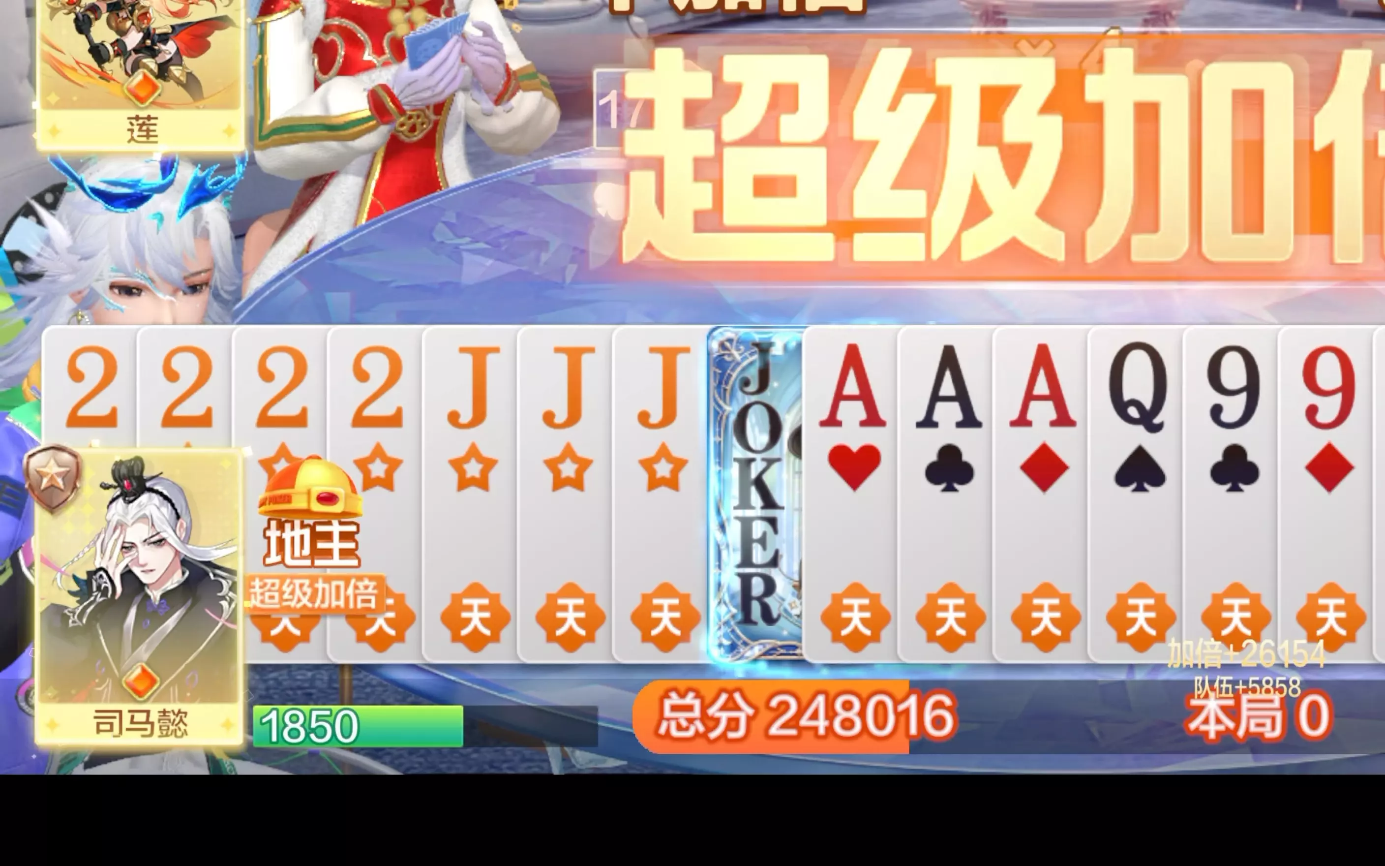 不叫,不叫,不叫,翻底牌。 叫地主,抢地主,抢地主。 这个赛季打了快2千局第一次遇到这种底牌,王炸又补癞