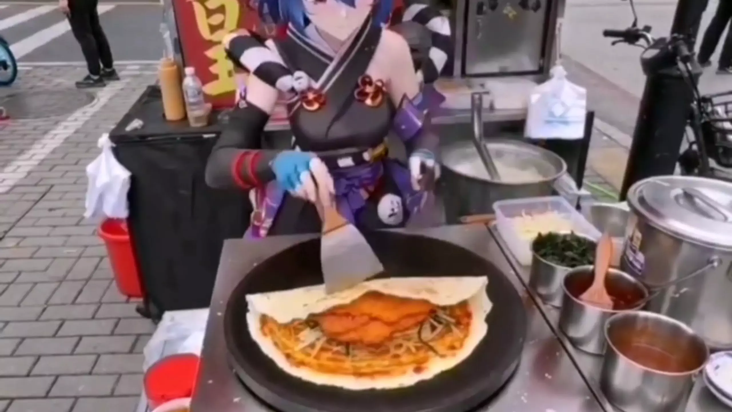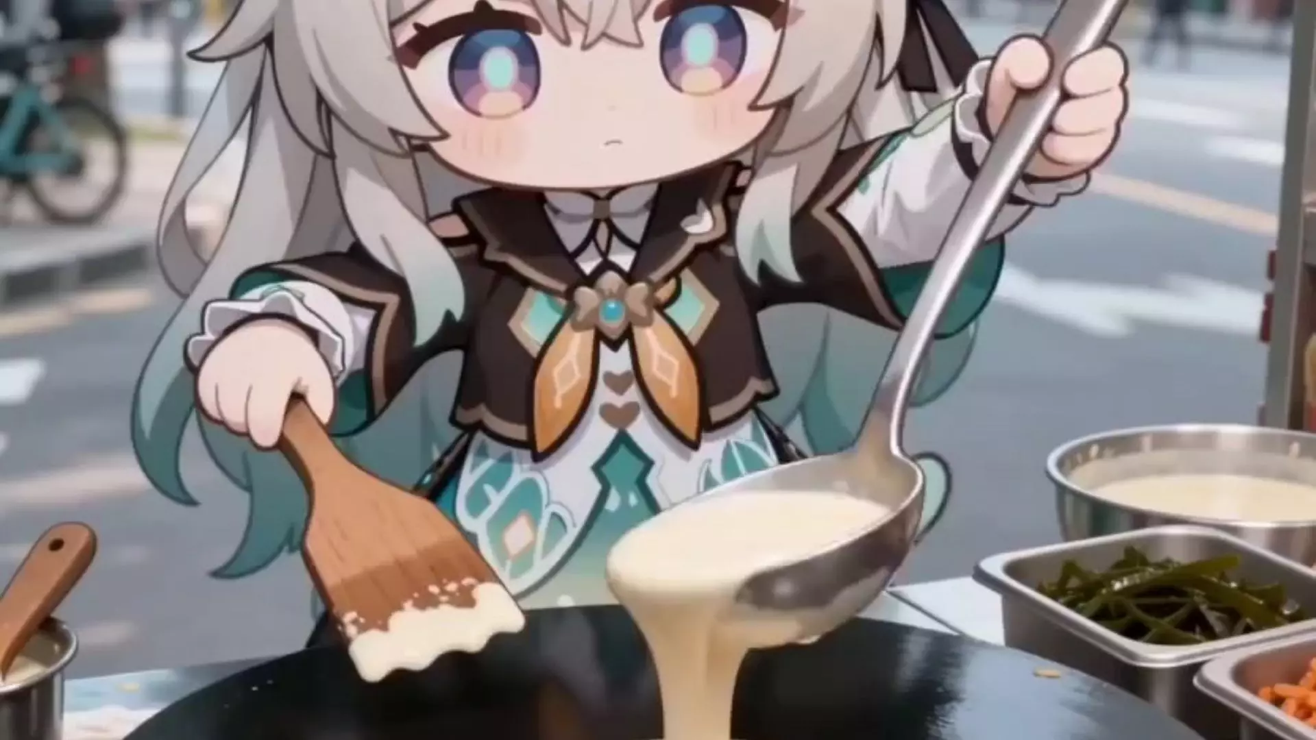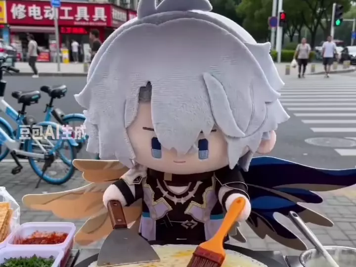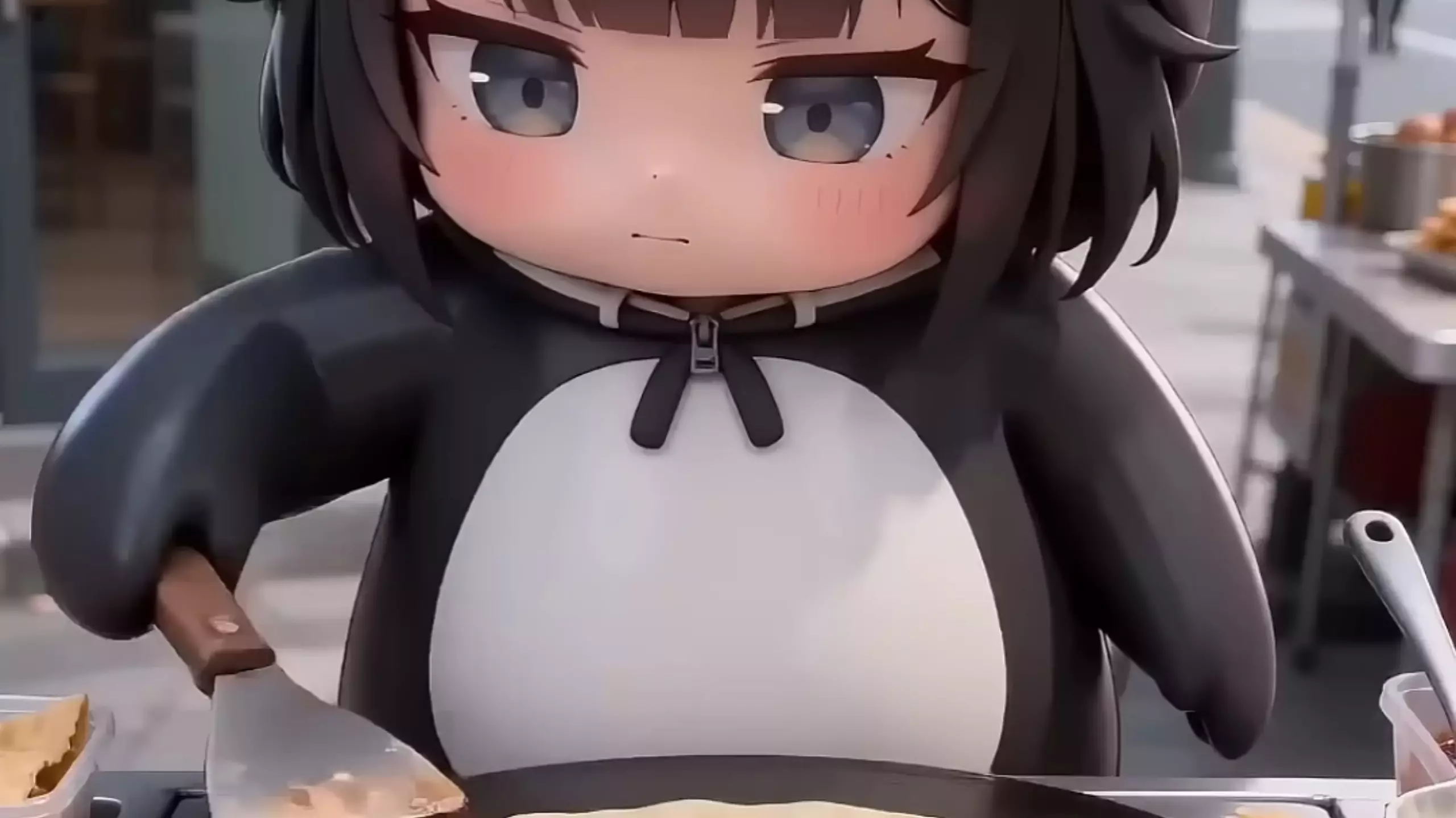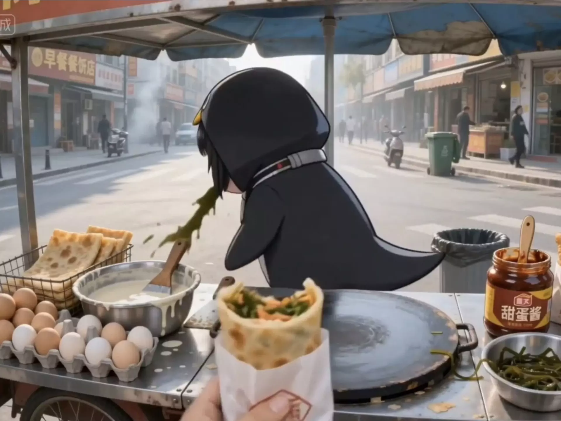 这是明日方舟相关的AI创作内容,咕咕嘎嘎小企鹅在街头摆煎饼摊制作煎饼,有趣的创意演绎,展现了明日方舟角色的趣味跨界日常。