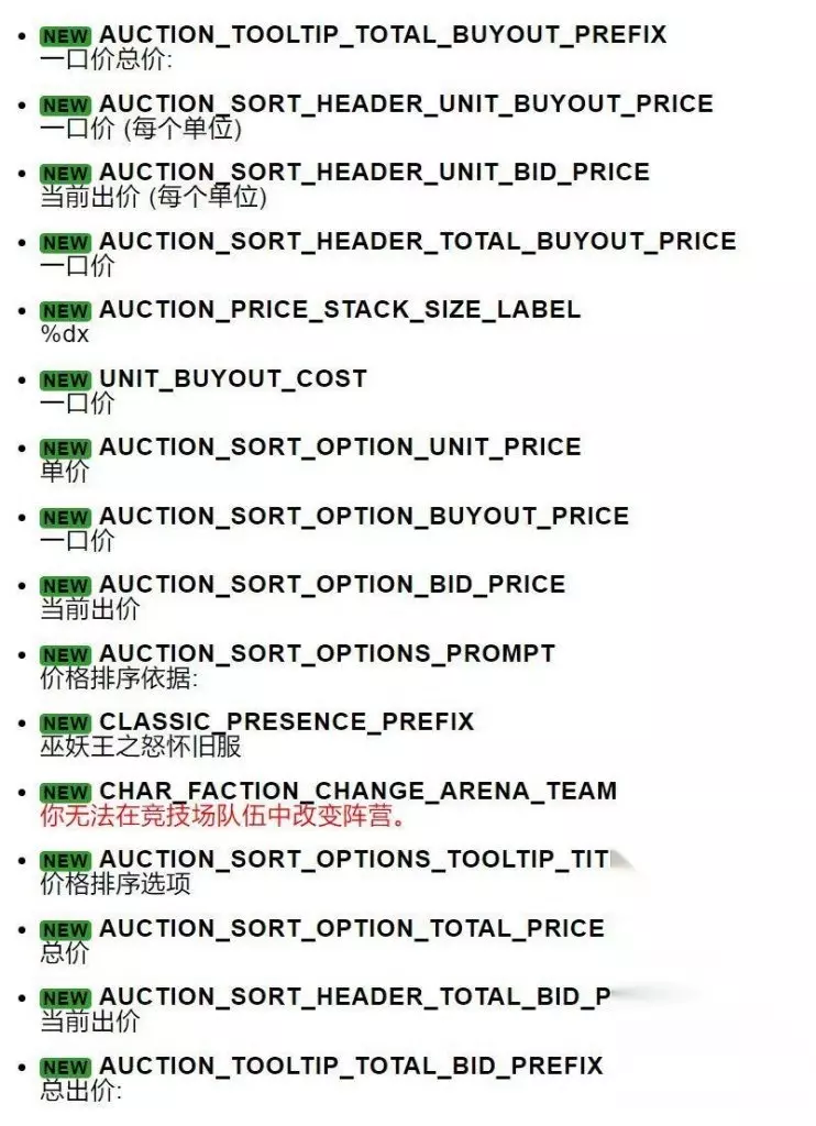 魔兽世界巫妖王之怒怀旧服的PTR测试服版本已经更新至Build3.4.1.46722,昨天就给大家介绍过关于5H新难度以及装备等级提升的消息。而今天根据窝窝头的数据挖掘,又有了一些不一样的内容,其中包括可能的拍卖行重大更新,以及转种族转阵营的信息。 拍卖行系统可能的重大更新 以下是窝窝头挖掘到的新版本游戏内的全局字符串: