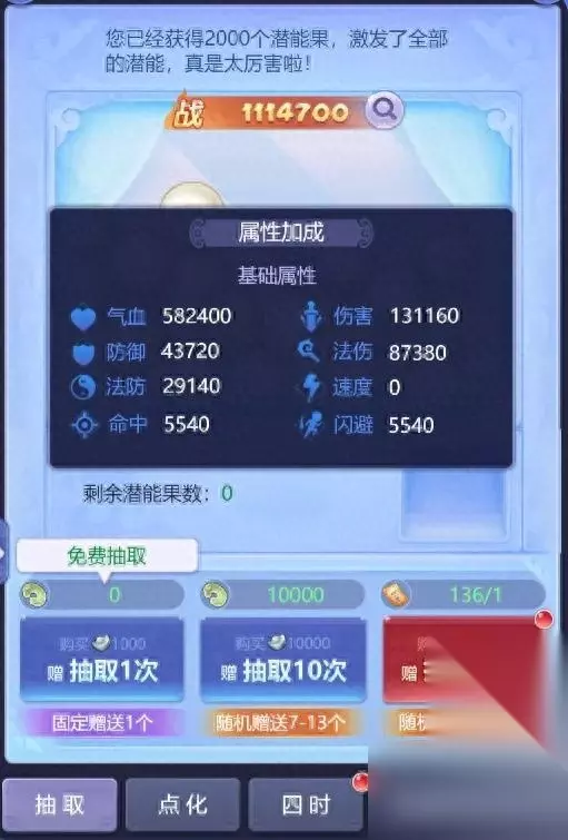 潜能果2000个就抽满了,后续获得均为溢出资源 共获得如下图的属性:(基础属性获得,没速度)