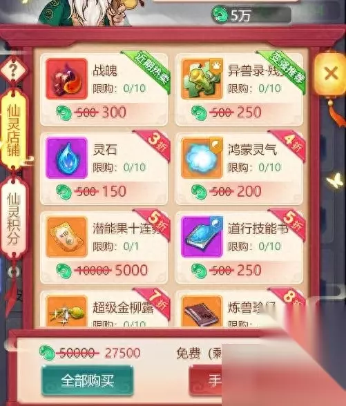 4.天像-基础/进阶属性和特殊属性的获取 这个板块是现在的新区开服活动里面的,必须要完成4个才能拿30个红牌子 ※关于这个材料的获取是基本除了运营活动就只有仙灵店铺or仙玉直购 这里有一个技巧就是,仙灵店铺刷折扣天象石,然后用积分对兑换潜能洗练石,这样能比较实惠的做完新区开服伙伴