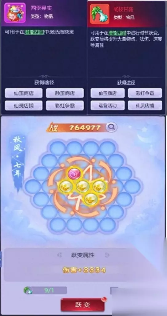 3.四时-可以获得基础属性,有一点点速度获得,很少! 四时的升级主要靠彩虹争霸任务 四季果实也可以靠静玉直接购买 杨枝甘露价值5000仙玉,彩虹任务获得,也可以仙灵店铺积分兑换(不推荐),偶尔节日获得也可以兑换 ※这个四时系统放在现在,是真的不值得投资仙玉和仙灵店铺积分去提升的,大家新号的话,不要为了这个去买礼包和花仙玉了! ※彩虹争霸活动攻略链接: 彩虹争霸(下一篇补充)