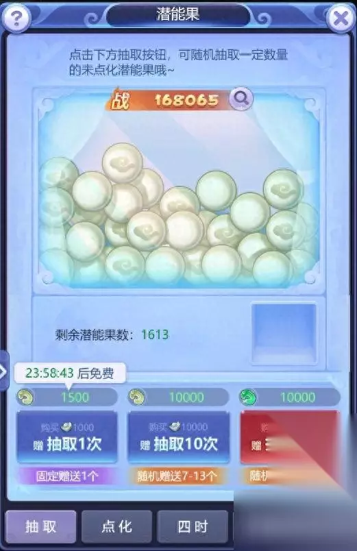 1.潜能果抽取 分为静玉和仙玉抽取两种方式。 ※不得不说,这个仙玉就是骗新手啊,纯粹坑玉的地方,大家一定要注意! 潜能果抽取后期不要投资任何静玉和仙玉进去(前期弄排名可以投入适当静玉),主要靠时间的白嫖以及长安保卫战的【潜能果十连卷】进行提升