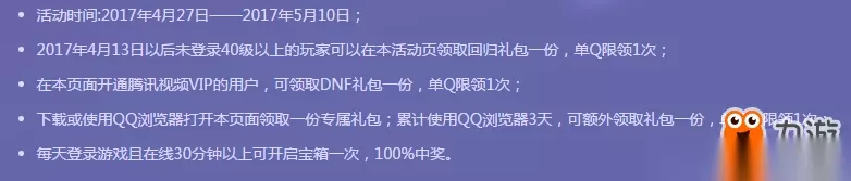 活动时间:4月27日~5月10日 活动内容: 一、阿拉德大陆等你归来 活动期间,2017年4月13日以后未登录40级以上的玩家可以在本活动页领取回归礼包一份,单Q限领1次