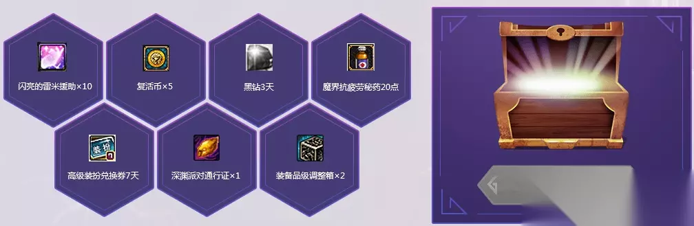 四、在线有礼 累计在线开宝箱100%有礼 活动期间,每天登录游戏且在线30分钟以上可以开启一次宝箱,可随机获得一个下方展示的礼品
